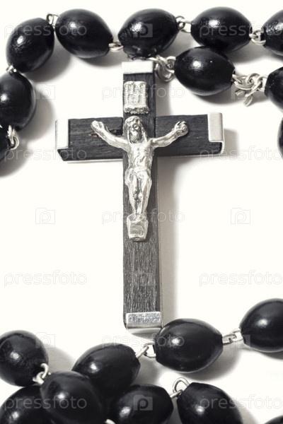 Католические четки и распятие на белом фоне