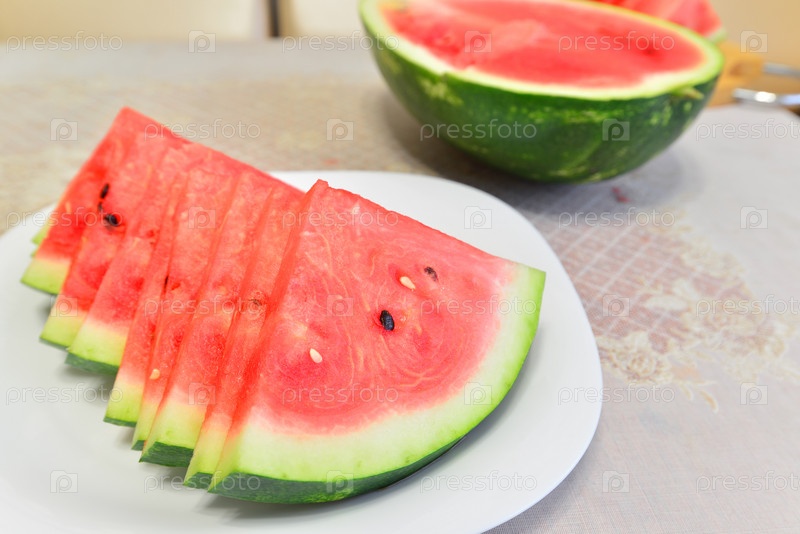 Кусочки арбуза на тарелку за столом