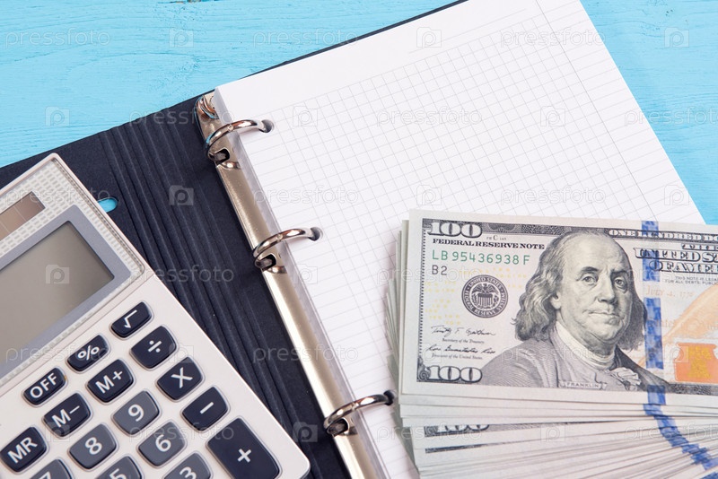 Деньги, калькулятор и пустой Блокнот