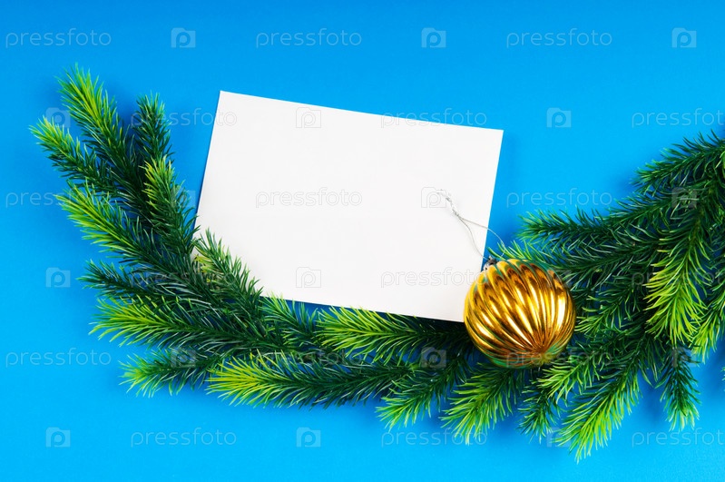 Белая карточка и ветка с елочным шаром на голубом фоне