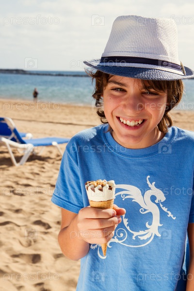 Мальчик ест мороженое на пляже
