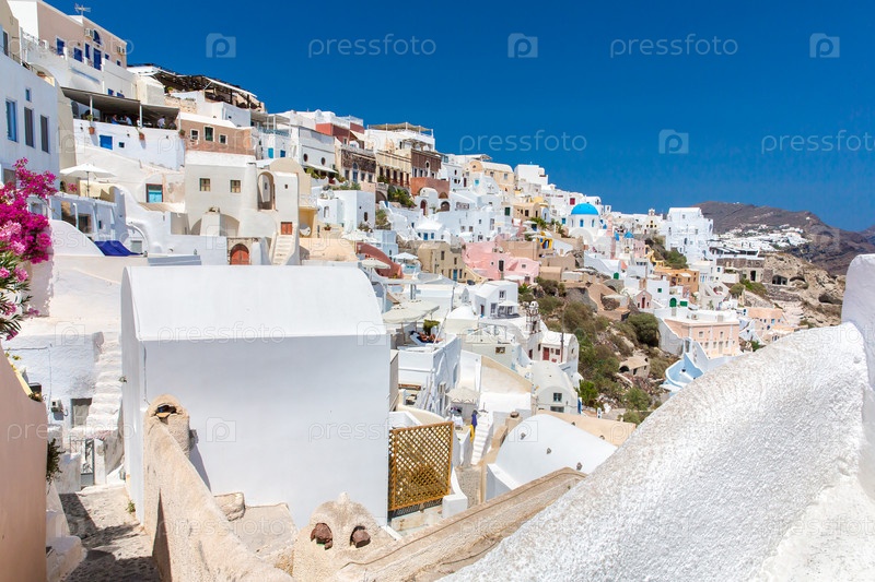 Вид на город Фира - остров Санторини, Крит, Греция. Белый бетонные лестницы, ведущей вниз красивая бухта с голубым небом и морем