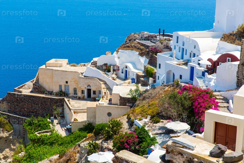 Вид на город Фира - остров Санторини, Греция. Белый бетонные лестницы, ведущей вниз красивая бухта с голубым небом и морем