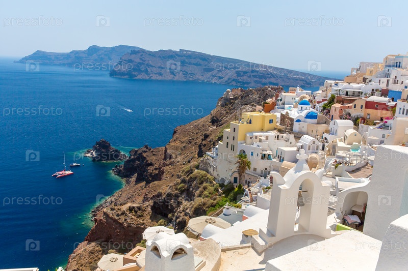 Вид на город Фира - остров Санторини, Греция. Белый бетонные лестницы, ведущей вниз красивая бухта с голубым небом и морем