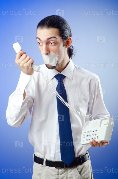 Бизнесмен с заклеенным ртом и телефоном в руках на голубом фоне
