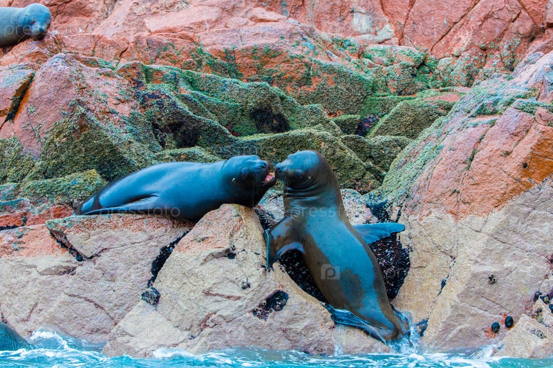 Южноамериканские морские львы расслабляющий на скалах острова Бальестаса в Национальный парк Паракас, Перу. Флора и фауна