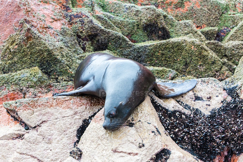 Южноамериканские морские львы расслабляющий на скалах острова Бальестаса в Национальный парк Паракас, Перу. Флора и фауна