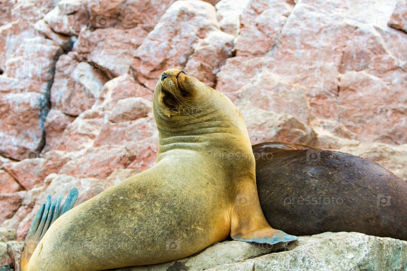 Южноамериканские морские львы на скалах острова Бальестаса в Национальный парк Паракас, Перу. Флора и фауна
