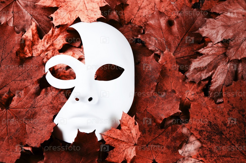 Белая карнавальная маска на кленовых листьях
