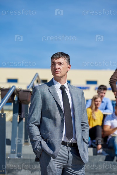 Учитель на фоне студентов на улице