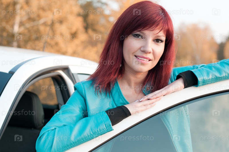 Молодая рыжеволосая девушка-водитель, стоящая рядом со своим автомобилем