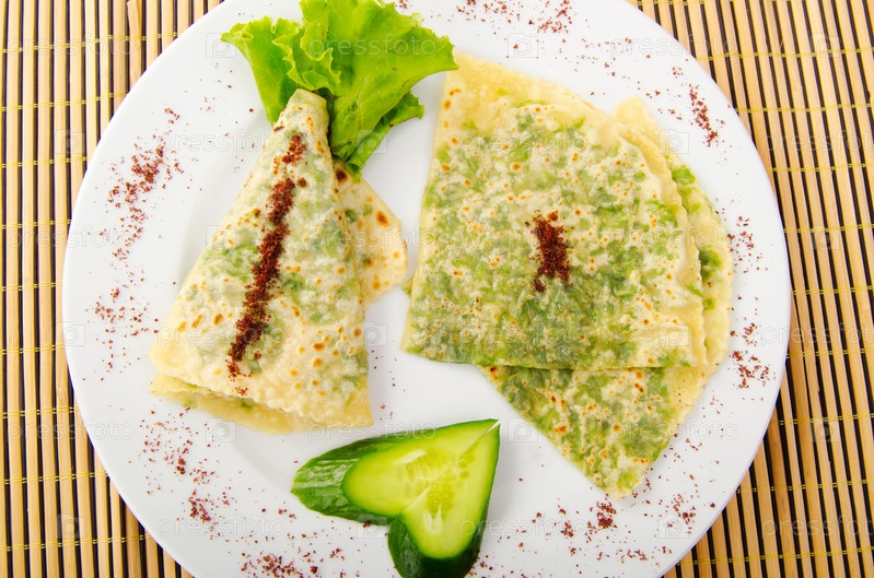 Блинчики с различными травами на тарелке с овощами