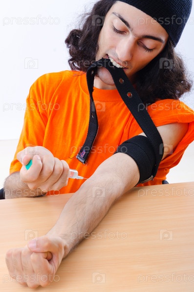 Молодой парень-наркоман, делающей себе инъекцию