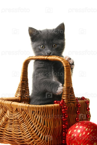 Маленький котенок в корзине с елочными украшениями