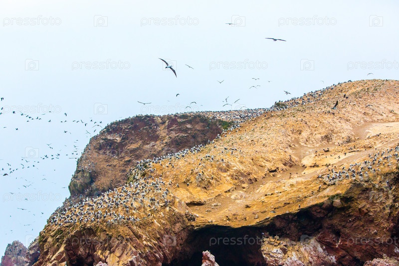 Множество птиц на прибрежных скалах