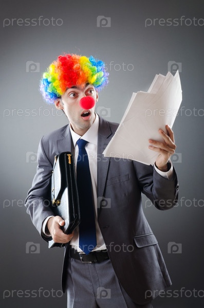 Молодой бизнесмен-клоун на сером фоне