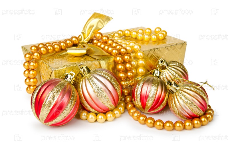 Новогодний подарок и елочные украшения на белом фоне