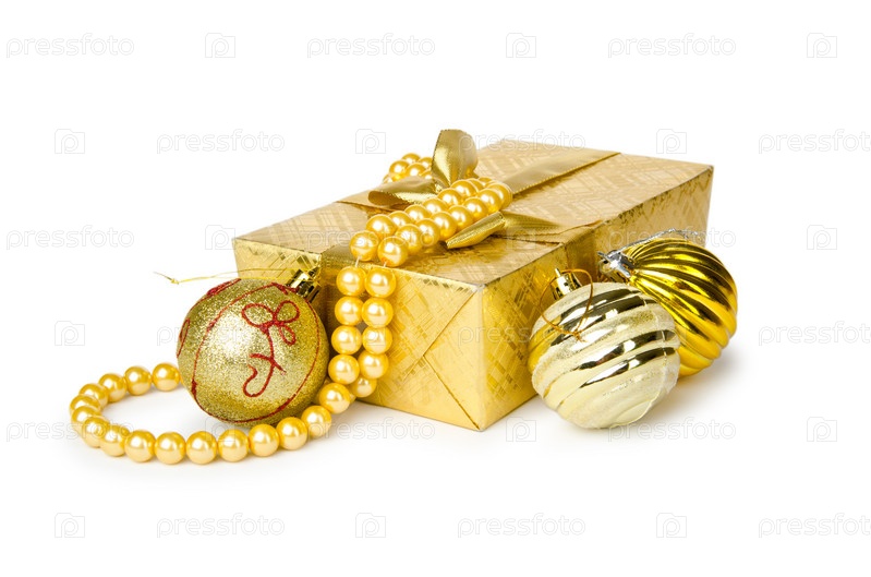 Новогодний подарок и елочные украшения на белом фоне