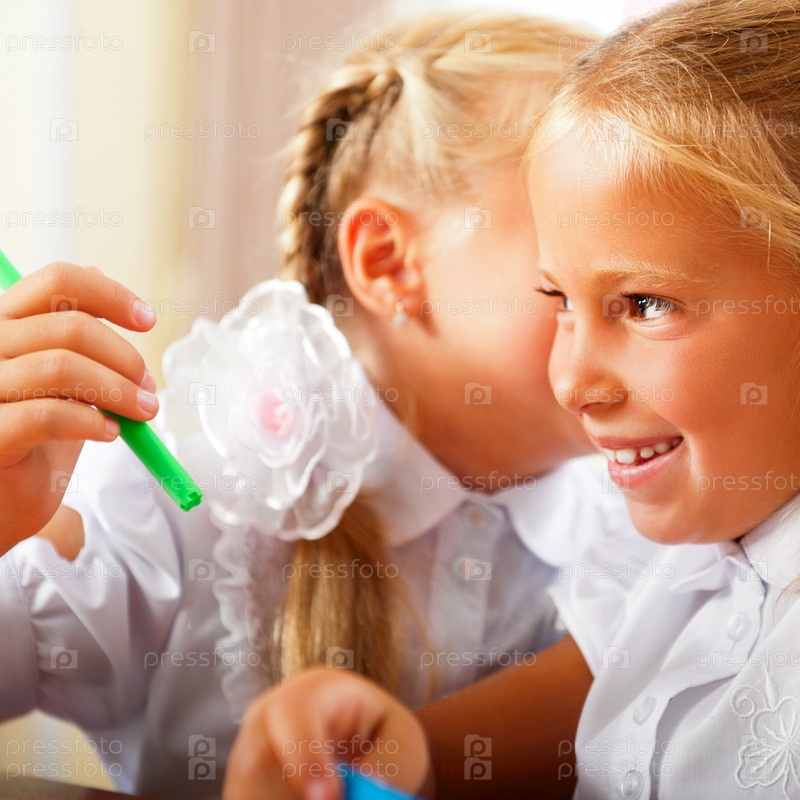 Две школьницы шепчутся во время урока