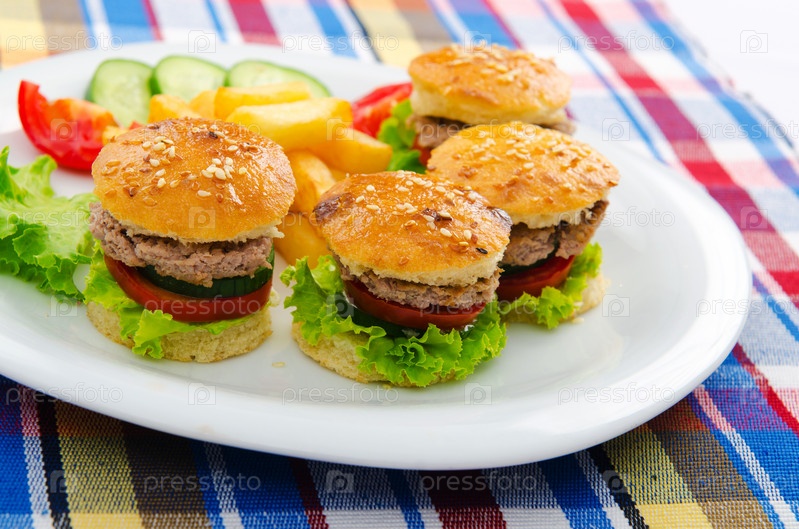 Бюргеры с картофелем фри и овощами на тарелке