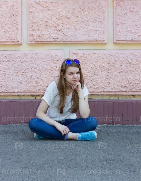 Девушка в джинсах сидит на асфальте