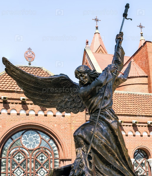 Скульптура "Архангел Михаил пронзает копьем змея" на фоне костела Святых Симеона и Елены, Минск, Беларусь