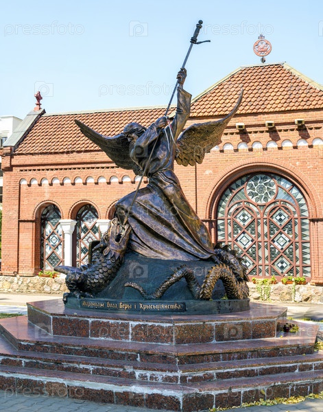 Скульптура "Архангел Михаил пронзает копьем змея" на фоне костела Святых Симеона и Елены, Минск, Беларусь