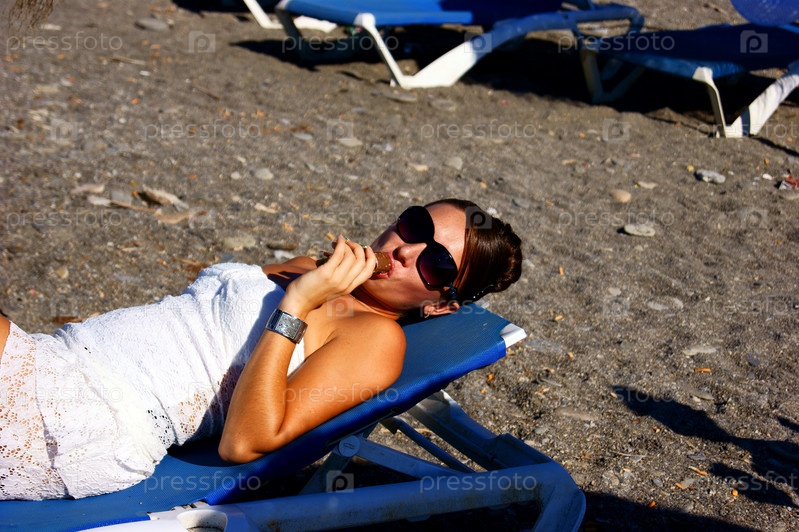 Симпатичная девушка ест мороженое на пляже