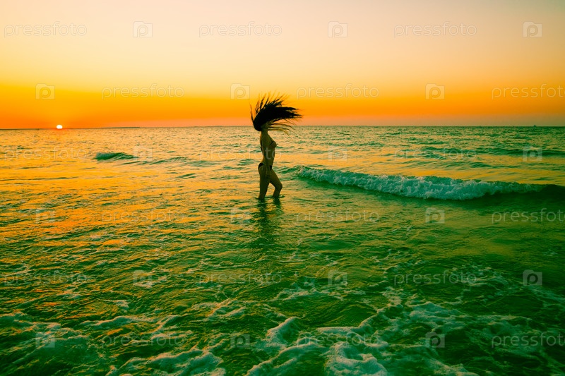 Красивая женщина с длинными волосами на закате на пляже