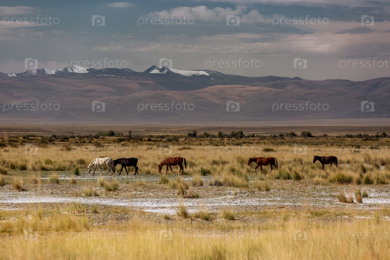 Лошади пасутся на фоне гор