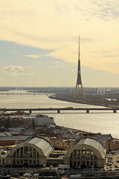 Вид на Ригу, реку Даугава и ТВ башню с колокольни церкви Св. Петра, Рига, Латвия