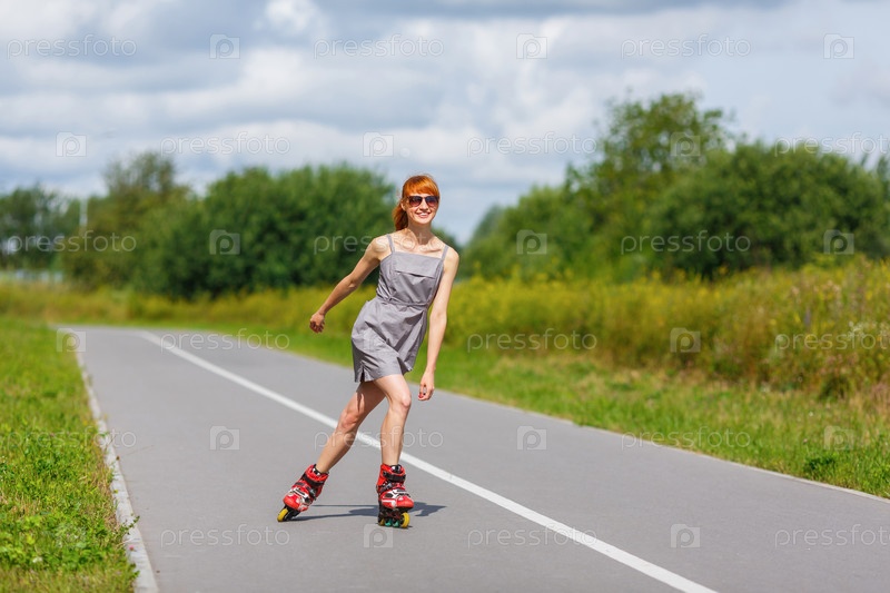Привлекательная девушка на роликах на дороге