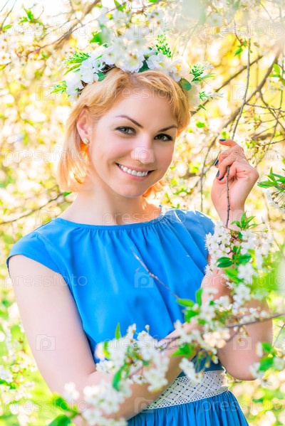 Красивая блондинка возле цветущего дерева
