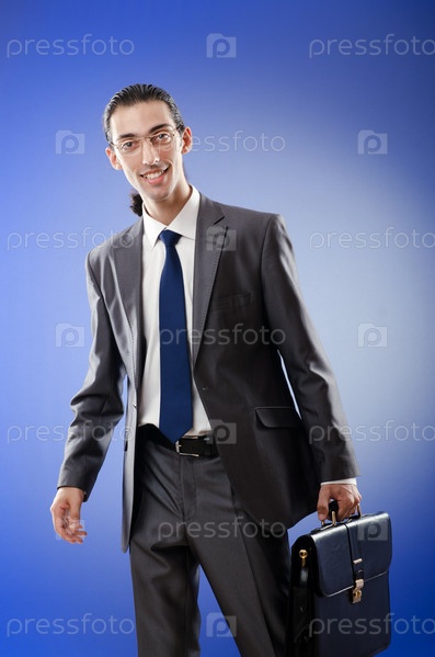 Молодой успешный бизнесмен с портфелем на голубом фоне