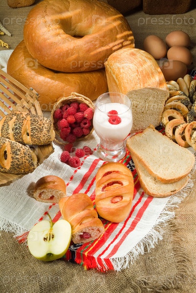Хлеб, ягоды, фрукты и молоко