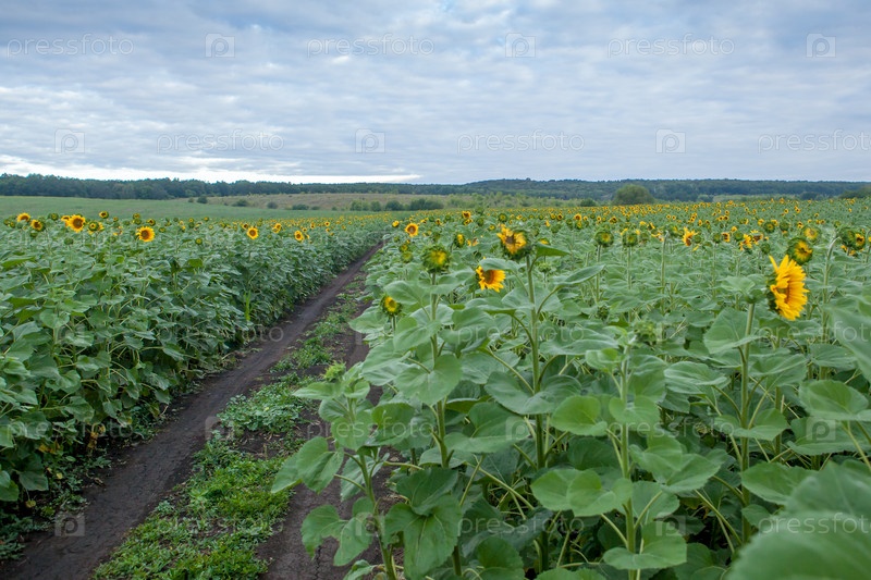 Поле подсолнухов в пасмурное утро