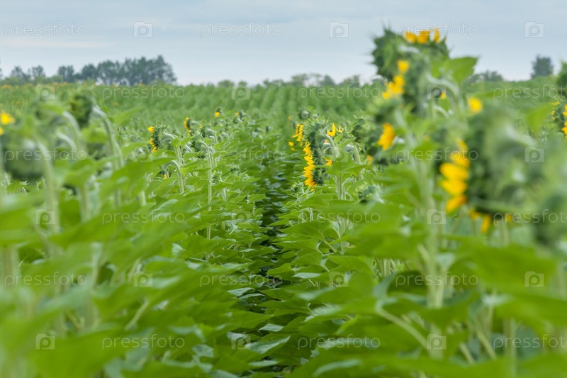 Поле подсолнухов в пасмурное утро