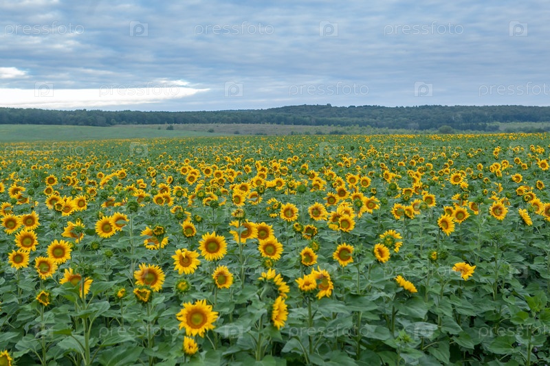 Поле подсолнухов в пасмурное утро