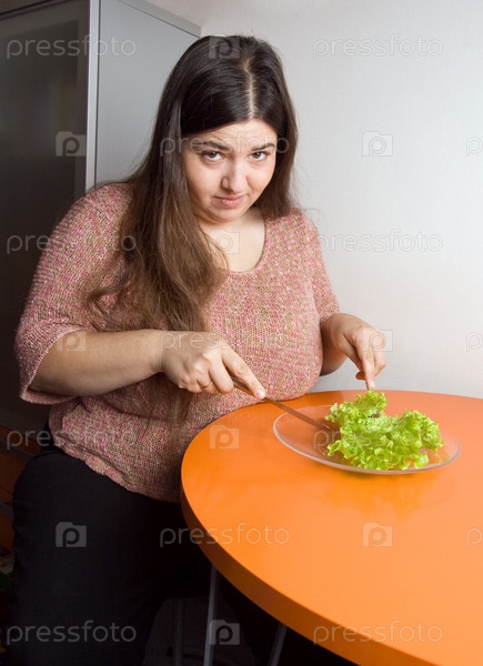 Толстая женщина пытается съесть лист салата