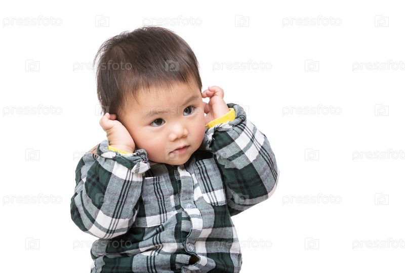 Азиатские мальчика коснуться ухом
