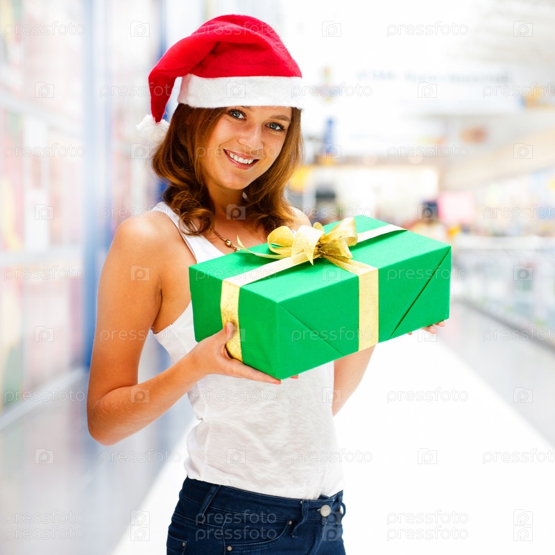 Молодая девушка в шапке Санта-Клауса с подарочной коробкой