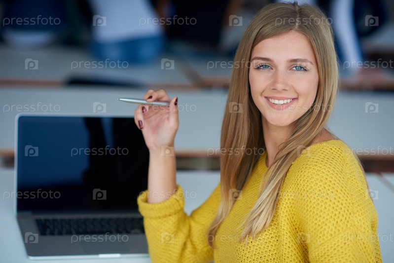 Портрет девушки студент счастливый улябающиеся в классе технология