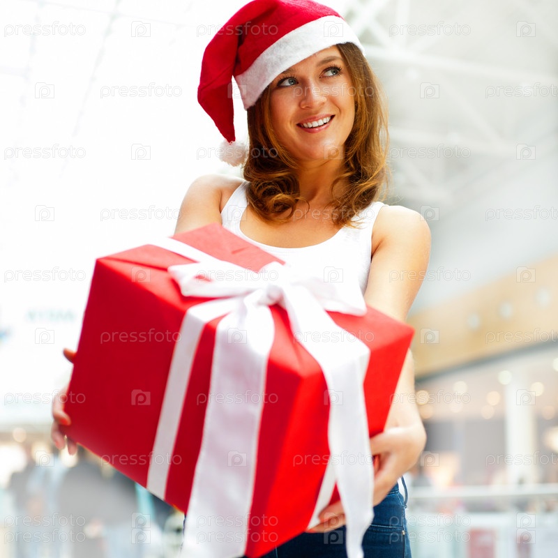 Молодая девушка в шапке Санта-Клауса держит в руках подарочную коробку
