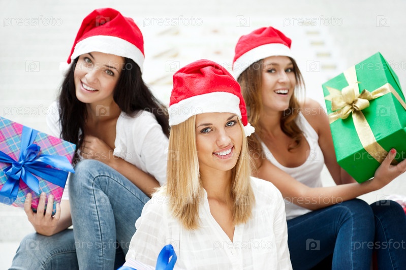 Три девушки в новогодних колпаках с подарками