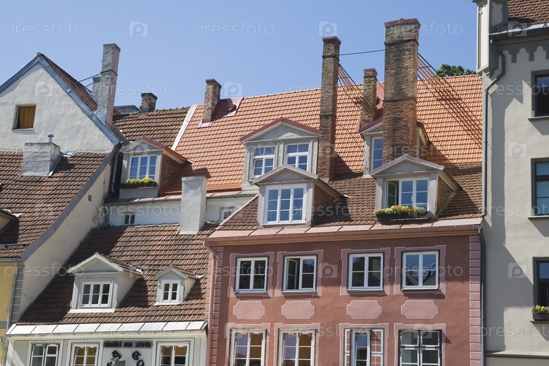 Крыши с каминами и мансардные окна старого европейского города Риги