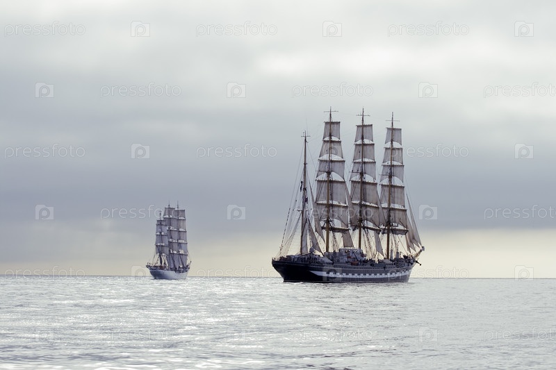 Две высокие корабли с белым паруса в спокойное море