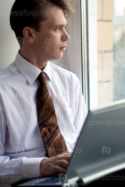 Портрет серьезного бизнесмена, который смотрит в окно во время работы