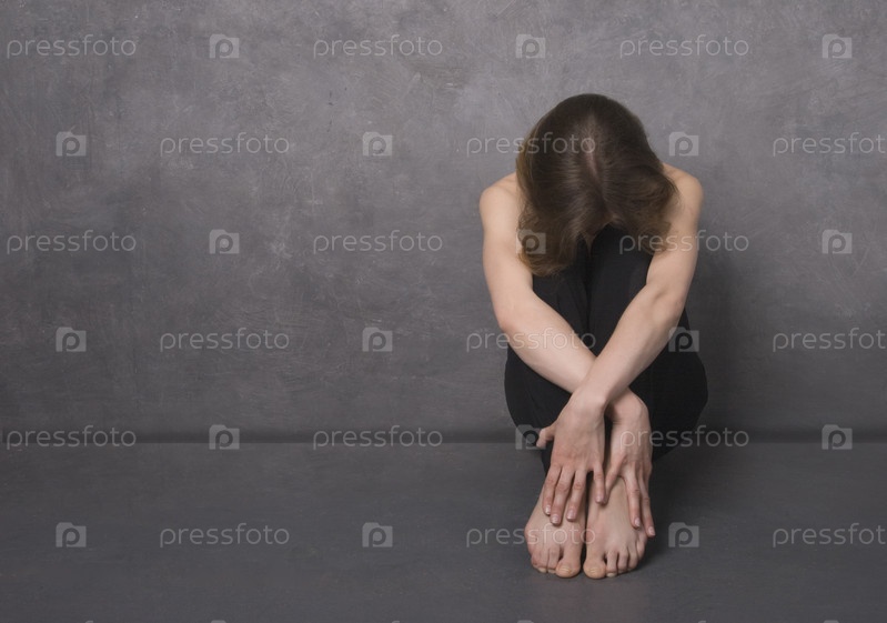 Грустно женщина, сидя на полу возле бетонной стены