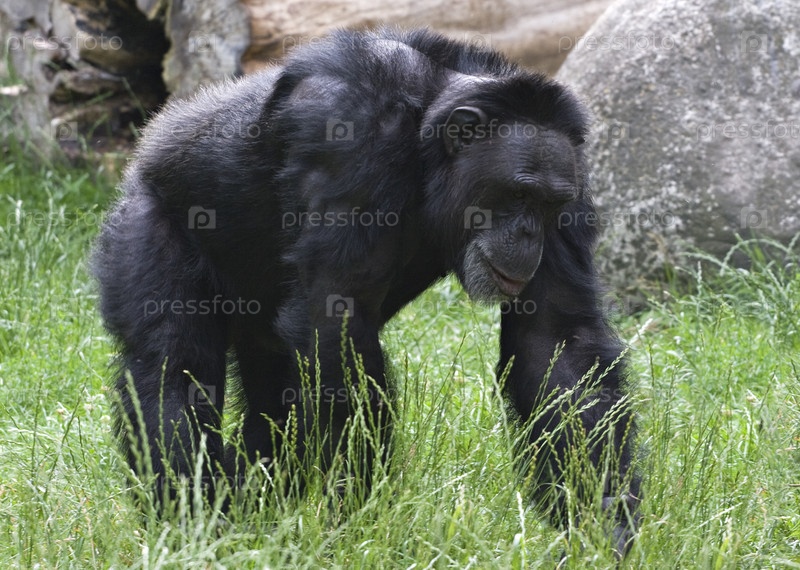 Взрослый черная горилла, ходить на траве в зоопарке