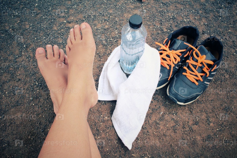 Селф футов и спортивная обувь с напиток из воды
